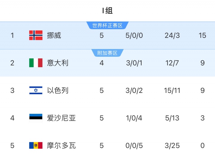 世预赛欧洲区I组,挪威5战全胜领跑,多赛1场领先第二名意大利6分+16个净胜球,剩余3轮将主场对阵以色列、主场对阵爱沙尼亚、客场对阵意大利。