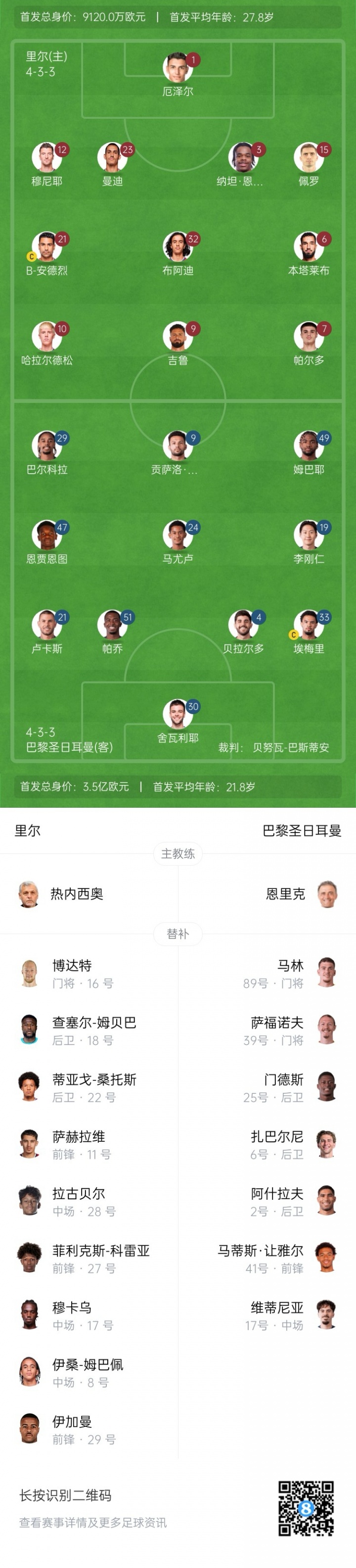 里尔替补:16-博达特、18-姆贝巴、22-蒂亚戈·桑托斯、8-伊桑·姆巴佩、11-萨赫拉维、17-穆卡乌、27-菲利克斯·科雷亚、28-拉古贝尔、29-哈姆扎·伊加曼